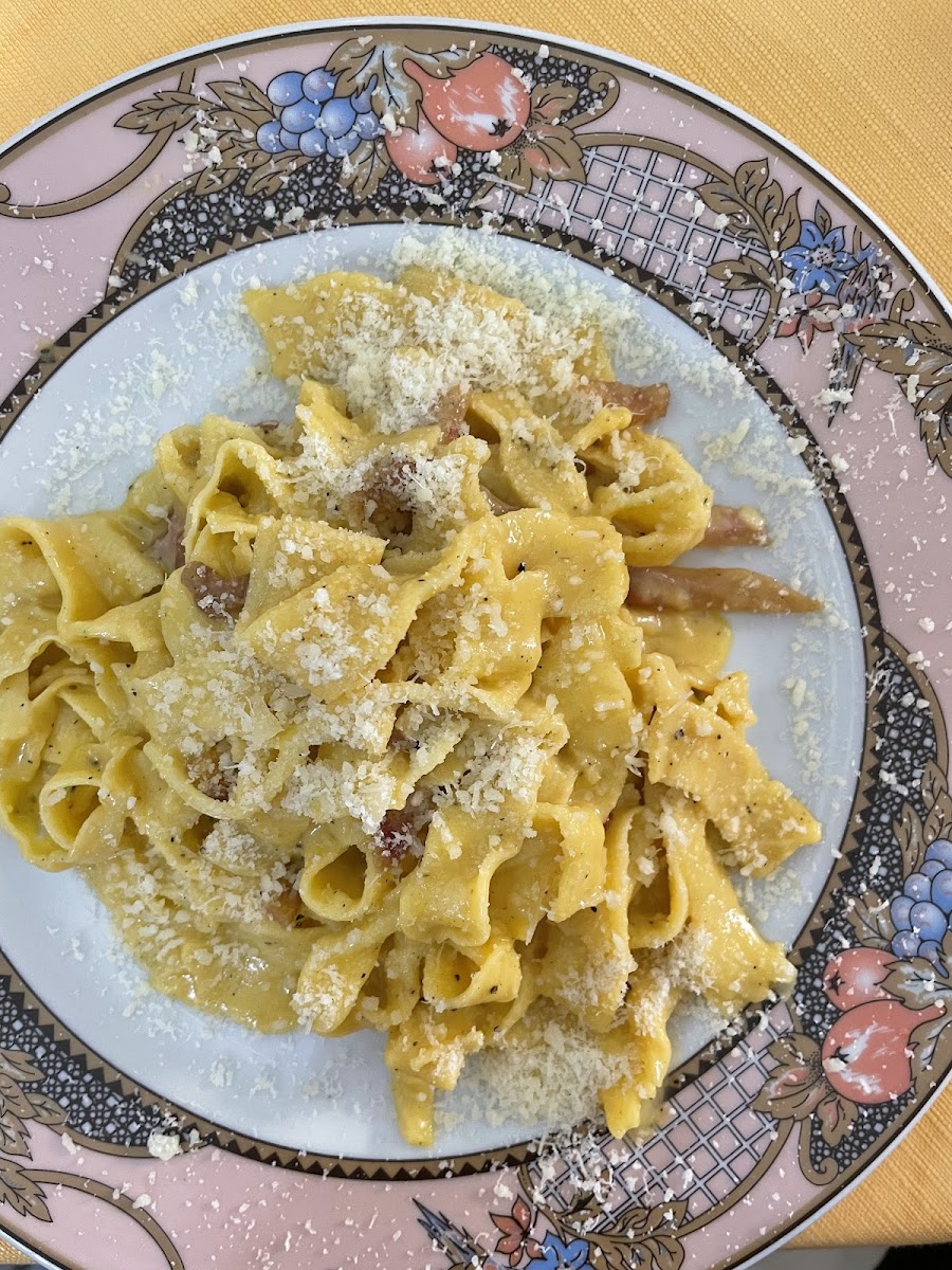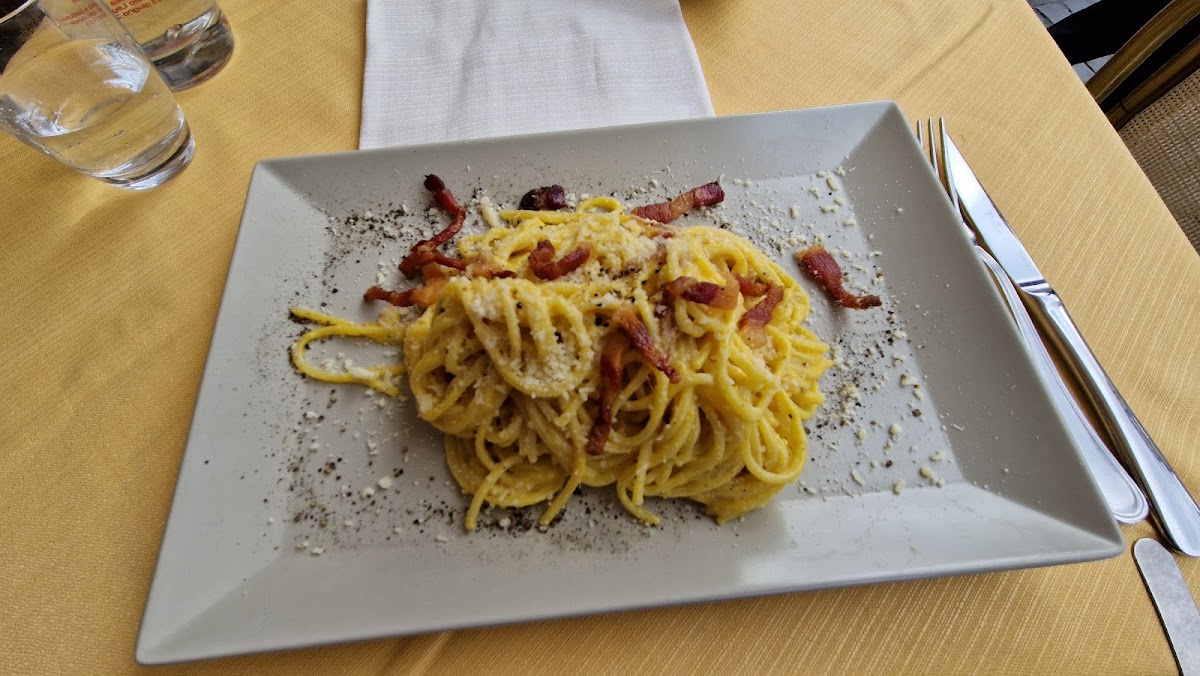 We had Bruschetta, spaghetti carbonara and spaghetti pesto. The food was exelent and the pasta was homemade and fresh. The staff was calm, polite and serviceminded. No running beteween tables and kitchen. They let us take a look at the menu without trying to drag us into the restaurant. They let us choose table. They came with the bill right away when we asked for it. We did not expect this from a restaurant located in the middle of a tourist sight, and was really positively surprised.